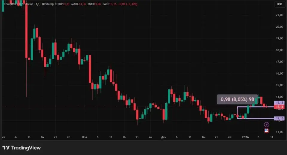 Цена криптовалюты Chainlink с 1 по 9 января увеличилась на 8,05%. Коин LINK смог оттолкнуться от минимумов середины декабря (ниже $12). Большая часть торговых сессий за неделю, пять, оказалась в плюсе.
