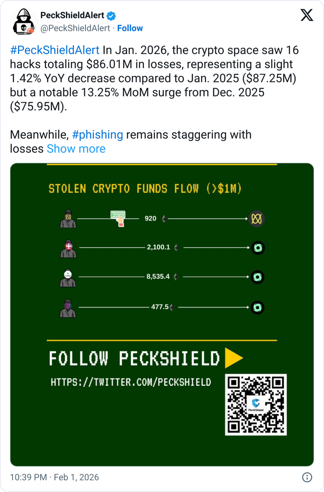 Совокупно успешными оказалось 16 хакерских атак с суммарным убытком в $86,01 млн. Метрика уменьшилась на 1,42% в сравнении с показателем годовой давности, но выросла на 13% относительно декабря.